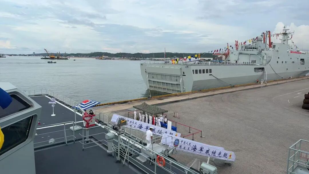 金秋十月,丹桂飘香,在这举国同庆的美好时节,柬埔寨西哈努克港上空晴空万里,海风轻拂间满是热烈与期待。10月10日,当地华人华侨与中资机构代表怀着无比振奋的心情齐聚港口,共同迎接中国海军83舰队——戚继光舰与沂蒙山舰的庄严入港,见证两国友谊的又一温暖瞬间。