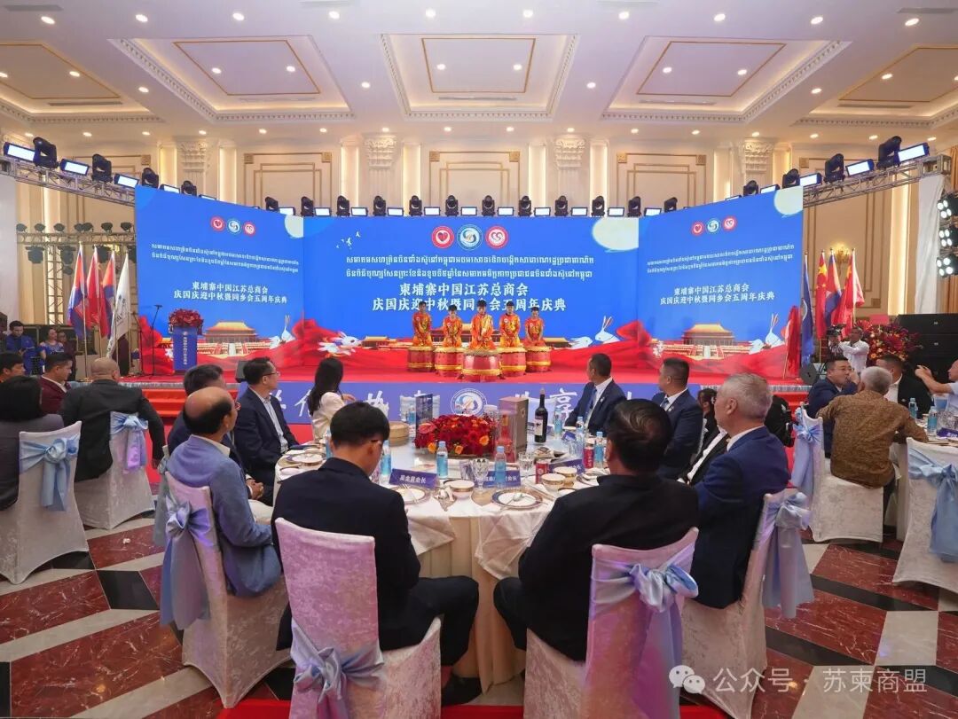 2025年10月4日,东盟江苏商会联盟理事单位、柬埔寨中国江苏总商会在金边隆重举办“庆国庆、迎中秋暨同乡联谊会成立五周年”庆典,700余位嘉宾出席活动。柬埔寨中国江苏总商会名誉会长包自勤、会长吴金艮,柬埔寨投资者商会联盟主席李坤泰,柬埔寨柬华理事总会常务副会长方灿成等各界代表出席活动并致辞。
