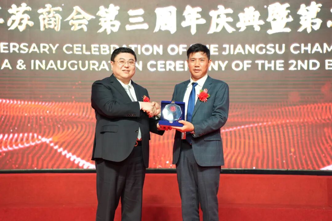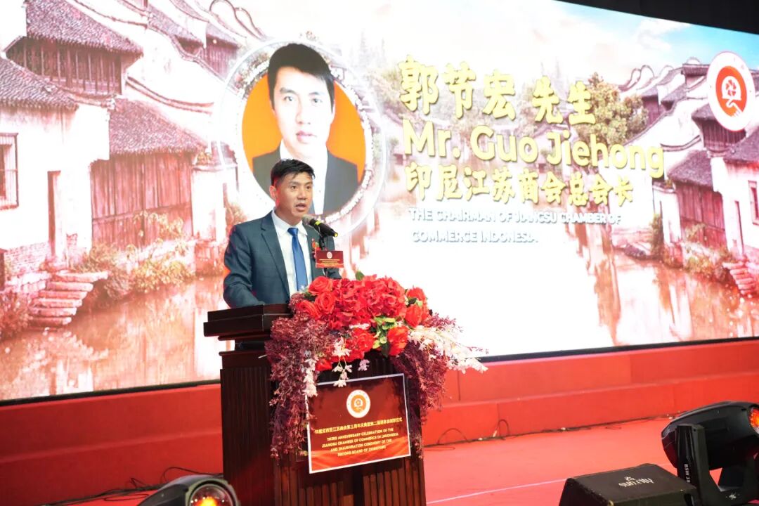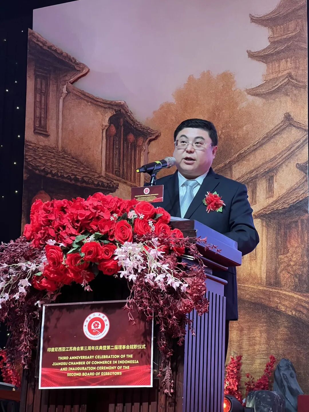 联盟轮值主席孙建炜作祝贺发言,首先热烈祝贺了商会成立三周年及郭节宏会长连任,高度肯定商会三年来在促进江苏与印尼经贸合作、企业落地、社会融入及文化交流方面的务实贡献。他强调印尼是江苏企业走进东盟的重要支点,未来应依托东盟江苏商会联盟,深化在产业园、智能制造、数字经济等领域的协同合作,推动“江苏智造”产业链在东盟形成合力,助力两国合作迈向更高水平。