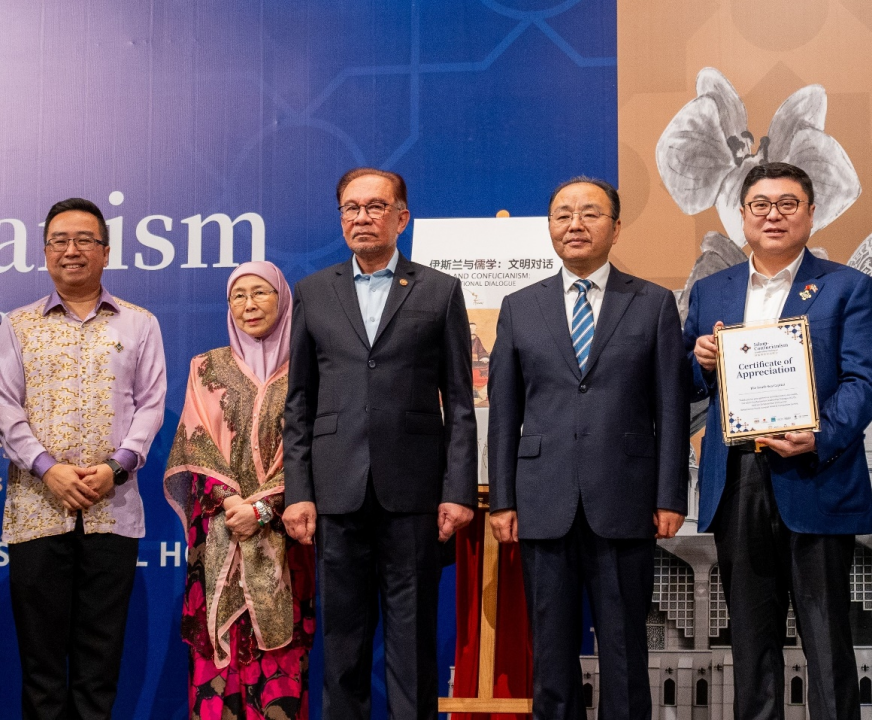 左起:安华首相夫人拿督斯里旺阿兹莎、首相拿督斯里安华、中国驻马来西亚特命全权大使欧阳玉靖等在回儒领导对话峰会给孙建炜总会长颁发感谢信